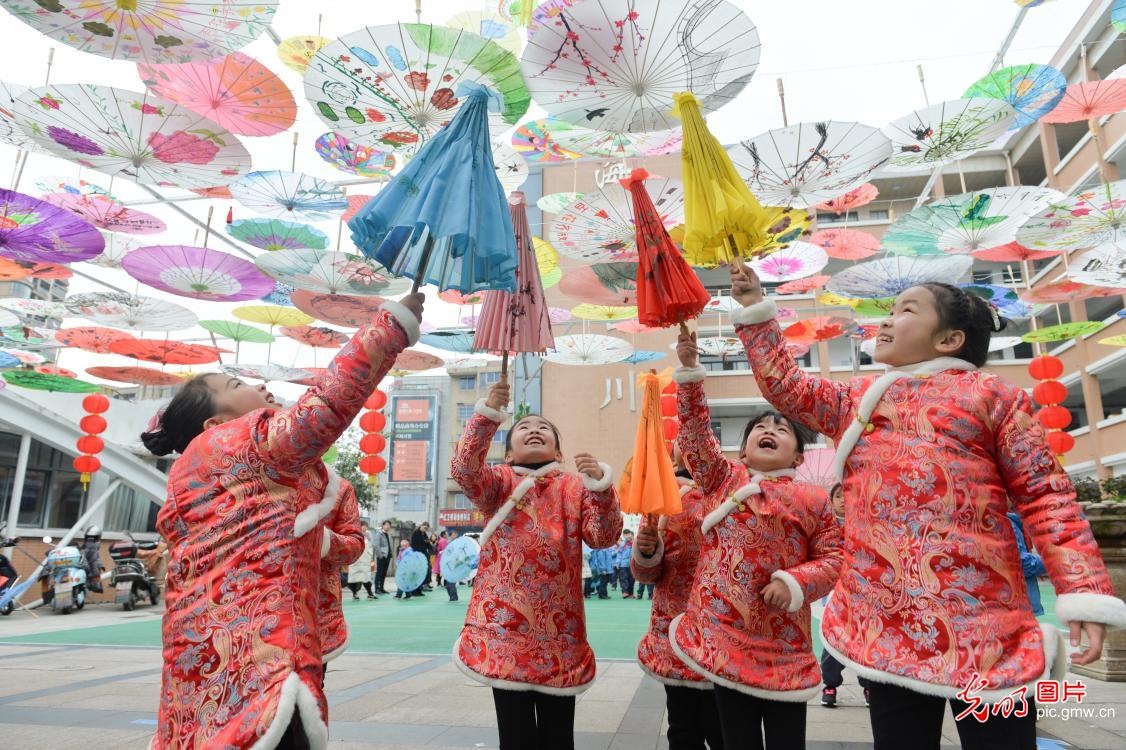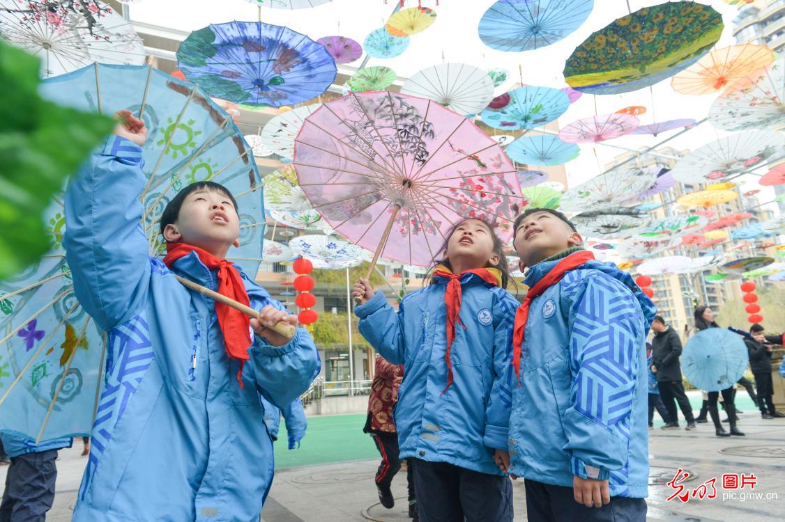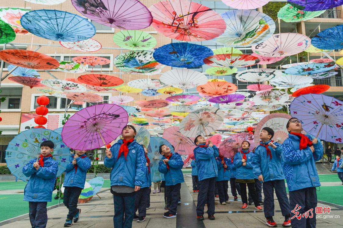 2019年2月19日,浙江省長興縣長興一小縣前街校區(qū)開展"紙傘綻放迎開學(xué)"活動(dòng),一千余把油紙傘裝扮校園,迎接開學(xué)。據(jù)悉,這些油紙扇都是學(xué)生們寒假里動(dòng)手繪制而成,旨在讓孩子們感受傳統(tǒng)文化的獨(dú)特魅力。(吳拯攝/光明圖片)
