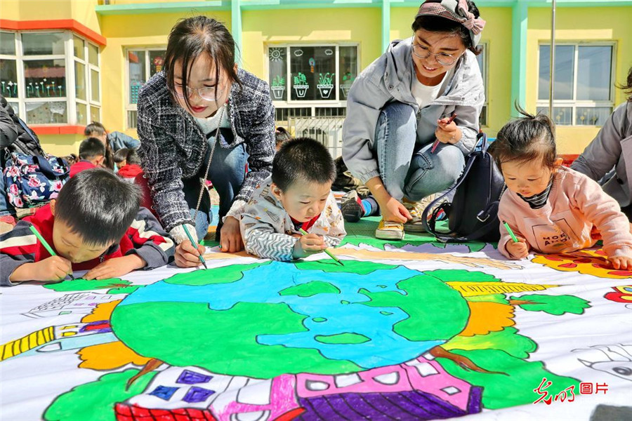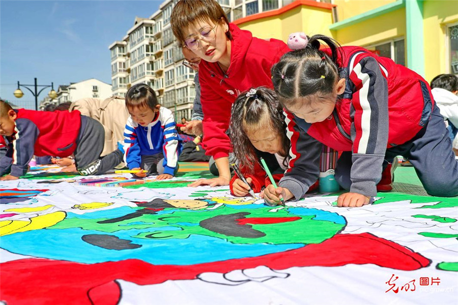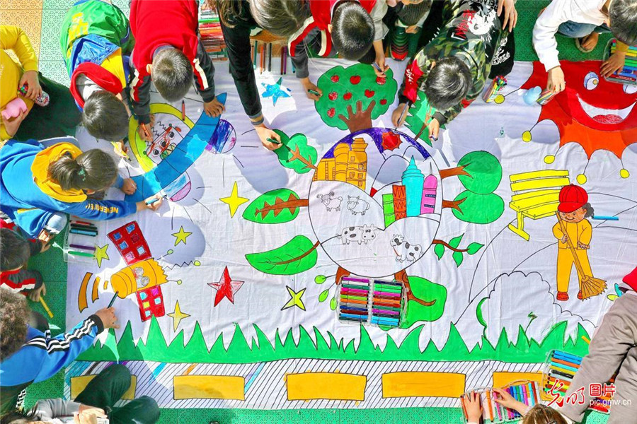 2019年4月18日,河北省秦皇島市海港區(qū)社區(qū)居民和小朋友共同彩繪長(zhǎng)卷。此次活動(dòng)由社區(qū)居民帶領(lǐng)轄區(qū)幼兒園小朋友用五彩畫(huà)筆在百米白色畫(huà)卷上畫(huà)出自己眼中的美麗地球,增強(qiáng)未成年人保護(hù)生態(tài)環(huán)境和愛(ài)護(hù)地球的意識(shí)。(曹建雄攝/光明圖片)