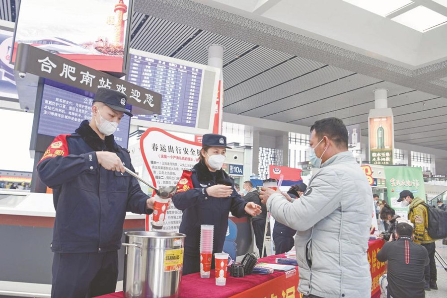 1月7日,2023年春運(yùn)拉開帷幕。圖為合肥鐵路公安處民警在合肥南站為旅客送上姜茶。合肥南站春運(yùn)的首日客流量相比去年同期有明顯回升。記者 溫沁 攝