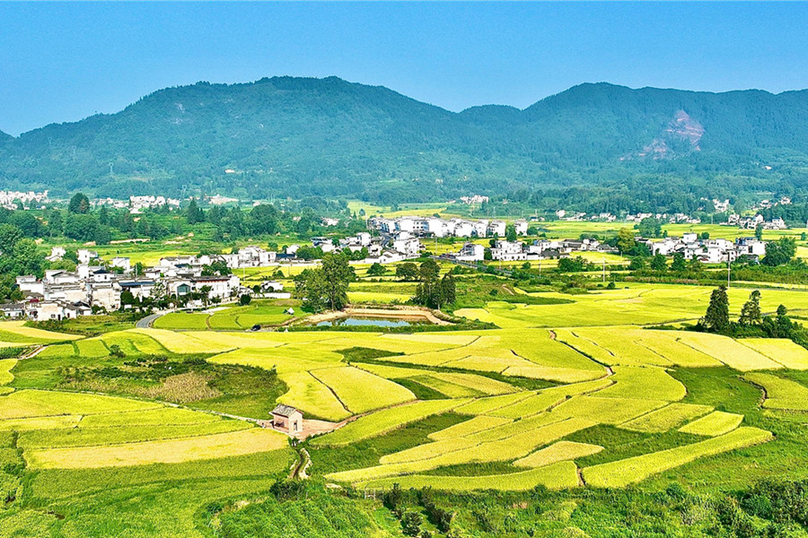 8月24日,黟縣碧陽(yáng)鎮(zhèn)潘村,金黃的田野與遠(yuǎn)山、晨霧、村莊共同組成一幅和美鄉(xiāng)村畫卷。