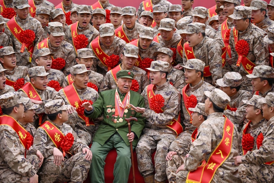 在安徽省合肥市國防動員訓練基地,抗戰老兵宣鉅華與新兵一起高唱《強軍戰歌》。(徐偉攝影)