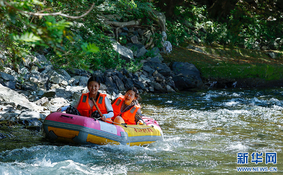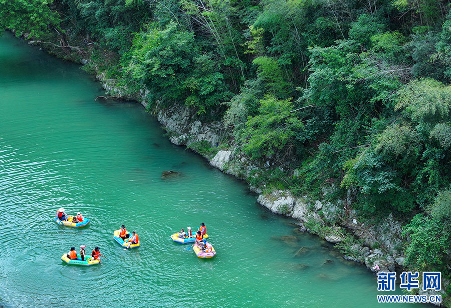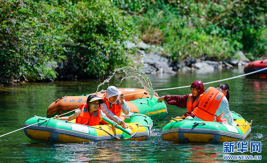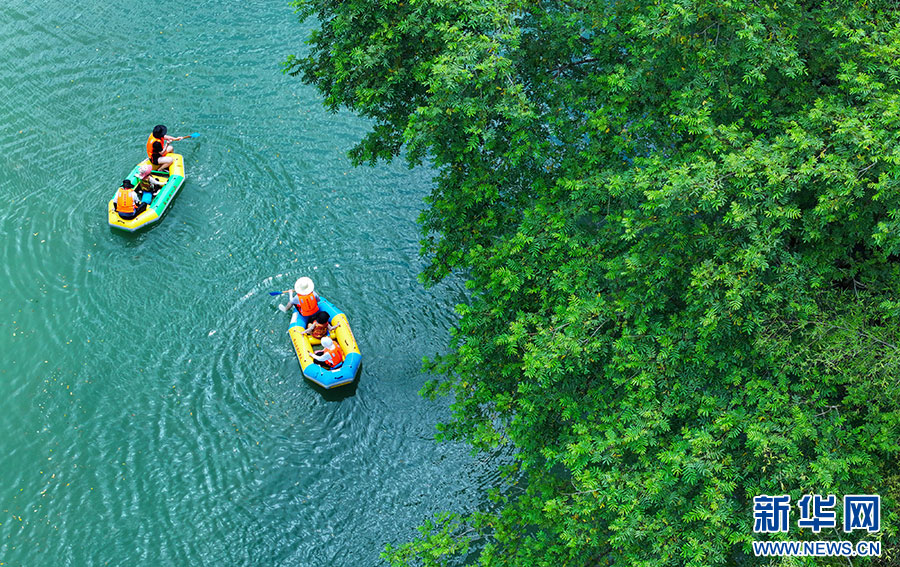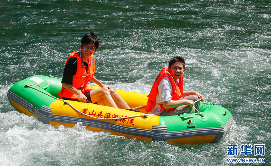 7月7日,游客在安徽省黃山市休寧縣夾溪河親水漂流。