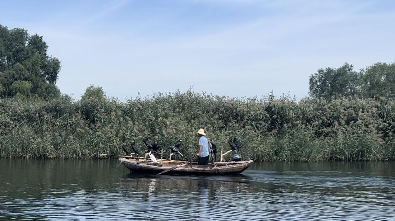船行至白洋淀中,兩側(cè)蘆葦蕩漾、荷葉連連,撐船而過的漁民帶著滿船的鸕鶿往蘆葦蕩深處駛?cè)ィ靡环L(fēng)景秀美、人與自然和諧共生的美好畫卷。