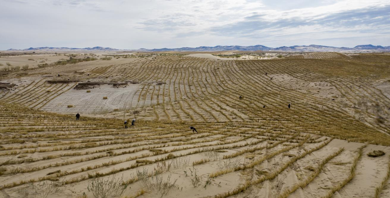 路修到哪里,草方格就織到哪里,綠色就蔓延到哪里。盛夏時(shí)節(jié),在翁牛特旗穿沙路其白線兩側(cè),大片的“稻草方格”隨著起伏的沙丘連綿延伸向遠(yuǎn)方,宛如一個(gè)個(gè)“治沙魔方”。
